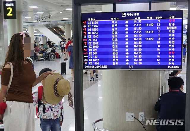 【제주=뉴시스】조수진 기자 = 22일 오후 제주국제공항에서 항공 이용객들이 출국장에 설치된 모니터를 통해 국내선 출발 항공 스케쥴을 바라보고 있다. 이날 제주공항은 낮 12시를 기해 태풍특보가 내려졌다. 2018.08.22.