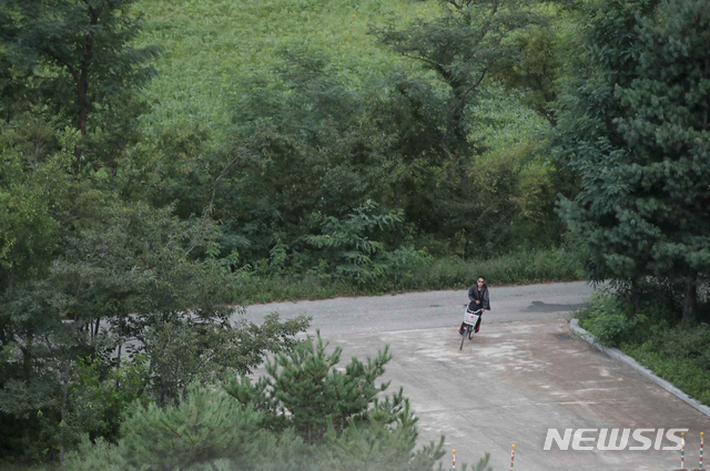 【금강산=뉴시스】김진아 기자 = 이산가족 상봉행사 1회차 마지막날인 22일 북한 외금강호텔에 북한 주민이 자전거를 타고 이동하고 있다. 2018.08.22. [email protected]