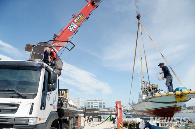 【군산=뉴시스】 김얼 기자 = 22일 전북 군산시 비응도동 비응항에 제19호 태풍 '솔릭'의 북상의 대비를 위한 어선들의 피항이 쉴 틈 없이 진행되고 있다. 2018.08.22 [email protected]