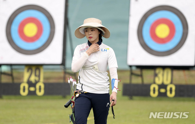 【자카르타(인도네시아)=뉴시스】최진석 기자 = 23일(현지시각) 오후 인도네시아 자카르타 겔로라 붕 카르노(GBK) 양궁장에서 열린 '2018 자카르타-팔렘방 아시아안게임' 양궁 여자 리커브 16강전에 출전한 장혜진이 과녁 확인 뒤 자리로 돌아가고 있다. 2018.08.23.