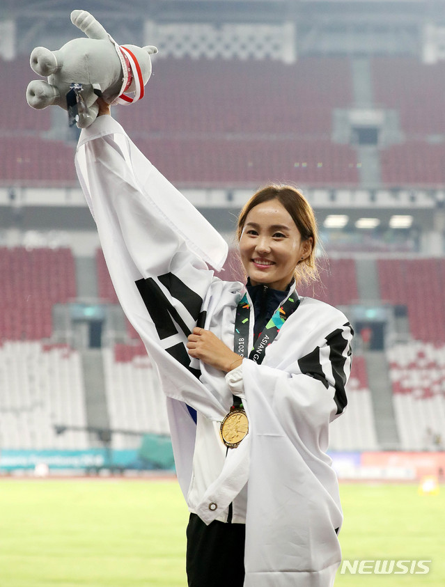 【자카르타(인도네시아)=뉴시스】추상철 기자 = 2018 자카르타-팔렘방 아시안게임 육상 여자 100m 허들 시상식이 열린 26일(현지시각) 오후 인도네시아 자카르타 겔로라 붕 카르노(GBK) 메인 스타디움에서 대한민국 정혜림이 금메달을 목에 걸고 마스코트를 올려 보이고 있다. 2018.08.26.