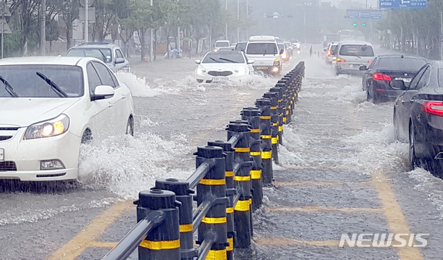 【광주=뉴시스】류형근 기자 = 27일 오전 광주 서구 한 교회 앞 도로가 천둥과 번개를 동반한 강한 비로 인해 침수됐다. 2018.08.27. (사진=독자 제공) [email protected]