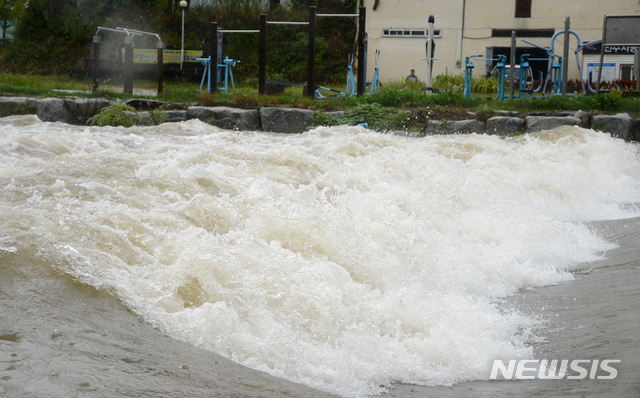 【전주=뉴시스】 김얼 기자 = 27일 전북 전주지역에 비가 쏟아져 내리는 가운데 전주시 백제교 일대의 전주천이 강한 물살로 인해 넘실대고 있다. 2018.08.27 [email protected]
