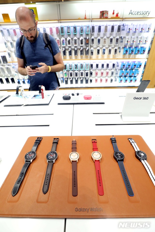 【서울=뉴시스】조성봉 기자 = 삼성전자가 시계 본연의 가치와 스마트한 사용성을 강화한 ‘갤럭시 워치(Galaxy Watch)’ 공식 판매를 시작한 27일 오후 서울 서초구 삼성전자 서초사옥 내 딜라이트 홍보관에서 고객들이 제품을 살펴보고 있다.