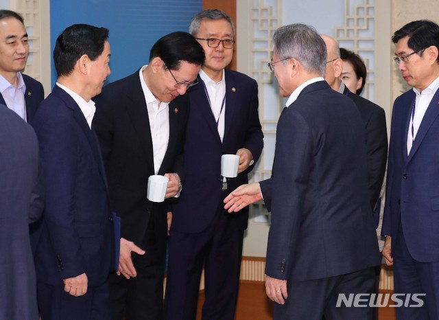 【서울=뉴시스】전신 기자 = 문재인 대통령이 28일 청와대 본관에서 열린 국무회의에 앞서 송영무 국방부 장관과 인사하고 있다. 2018.08.28.