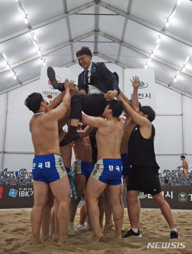 【서울=뉴시스】최동준 기자 = 28일 강원 춘천시 춘천닭갈비,막국수축제장 내 특설씨름경기장에서 열린 '제4회 춘천소양강배전국장사씨름대회' 대학부 단체전에서 10년 만에 우승을 차지한 단국대학교(충청남도) 주두식 감독이 행가레를 받고 있다. 2018.08.28. (사진=대한씨름협회 제공)