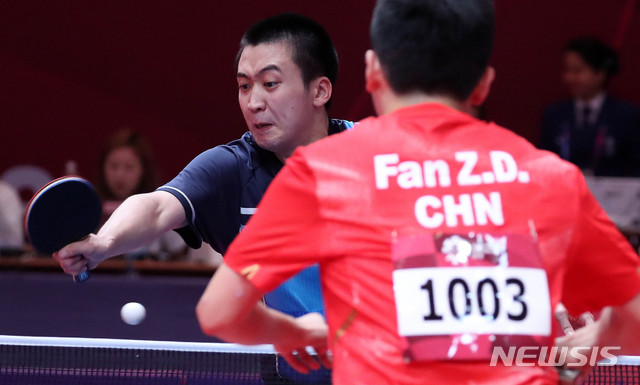【자카르타(인도네시아)=뉴시스】추상철 기자 = 2018 자카르타-팔렘방 아시안게임 남자 탁구 단체전 결승경기가 열린 28일(현지시각) 오후 인도네시아 자카르타 엑스포에서 대한민국 정영식이 중국과 경기를 펼치고 있다. 2018.08.28.