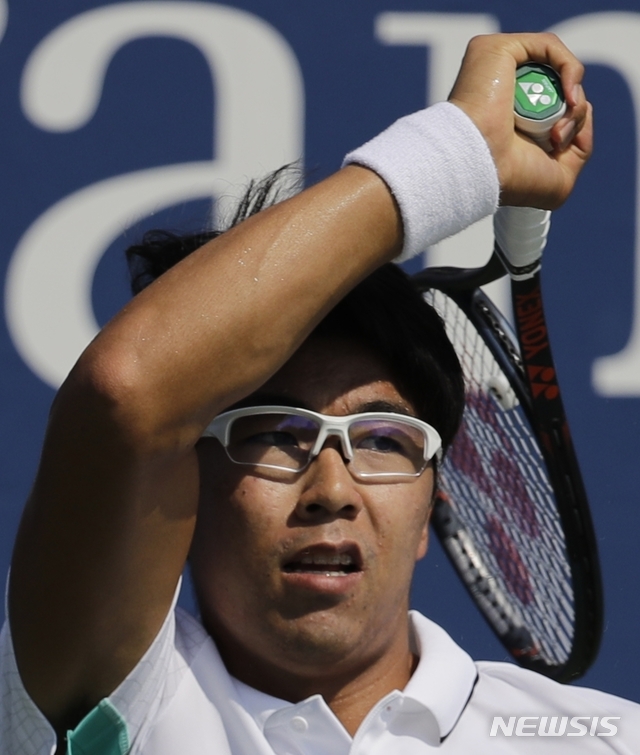 【뉴욕=AP/뉴시스】 28일(현지시간) 미국 뉴욕에서 열린 US오픈 테니스대회 1회전에서 정현(22·한국체대·세계랭킹 23위)이 베란키스(리투아니아·세계랭킹 104위)를 상대로 리턴을 날리고 있다. 이날 정현은 3세트에서 역전에 성공해 세트스코어 2-1로 앞선 4세트에 기권승을 거뒀다.