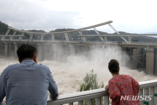 【하남=뉴시스】전진환 기자 = 지난밤 국지적 집중호우가 내린 가운데 29일 오전 경기도 하남시 팔당댐이 수위조절을 위해 수문 5개를 열어 방류하고 있다.  2018.08.29.