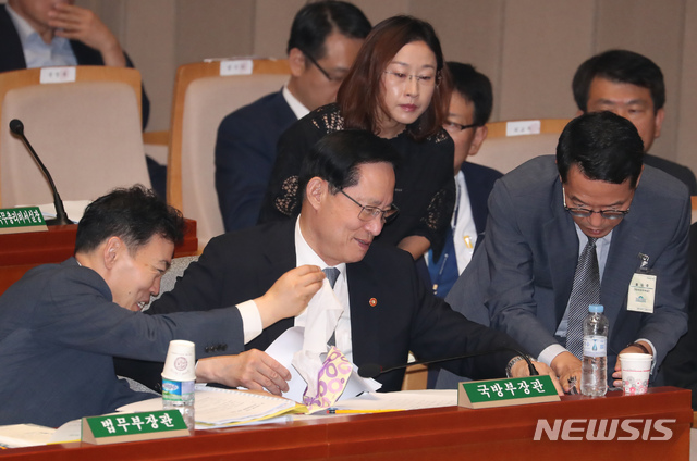 【서울=뉴시스】고승민 기자 = 29일 오전 서울 여의도 국회에서 2017회계연도 결산, 예비비지출 승인의 건을 안건으로 열린 제6차 예산결산특별위원회에서 송영무 국방부 장관이 컵에 따라 둔 물을 쏟아 관계자들과 물을 닦고 있다. 2018.08.29.