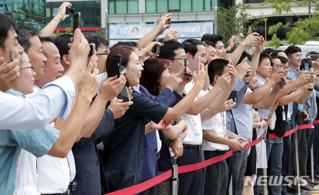 【원주=뉴시스】박진희 기자 = 29일 강원도 원주시 국민건강보험공단 앞에서 시민들이 2018 공공기관장 워크숍을 마치고 나오는 문재인 대통령을 촬영하고 있다. 2018.08.29.
