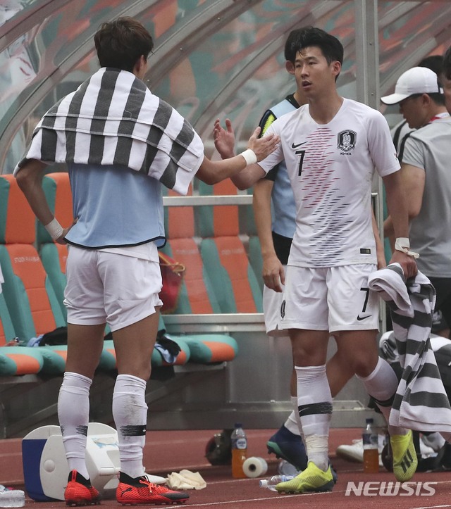 【치비농(인도네시아)=뉴시스】최진석 기자 = 29일(현지시각) 오후 인도네시아 치비농 파칸사리 스타디움에서 열린 '2018 자카르타·팔렘방 아시안게임' 남자 축구 대한민국과 베트남의 경기. 대한민국 손흥민이 교체 벤치로 들어가며 황희조와 하이파이브하고 있다. (Canon EOS-1D X Mark Ⅱ EF200-400 f4 IS Ⅱ USM ISO 3200, 셔터 1/1000 조리개 5.6) 2018.08.29.