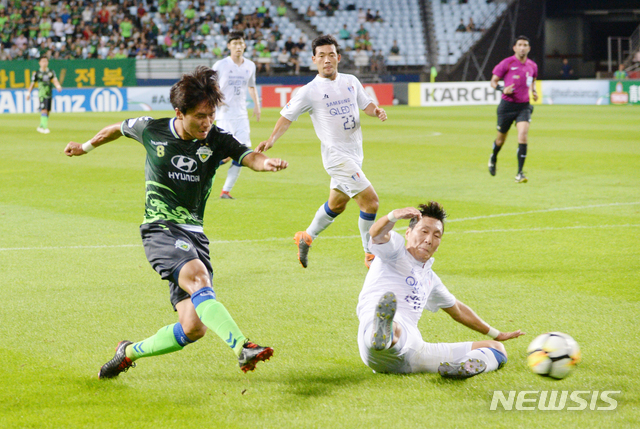 【전주=뉴시스】 김얼 기자 = 2018 아시아축구연맹(AFC) 챔피언스리그 8강 1차전 전북 현대와 수원 삼성의 경기가 29일 전북 전주시 전주월드컵경기장에서 실시된 가운데 전북현대 정혁 선수가 슛을 시도하고 있다. 2018.08.29