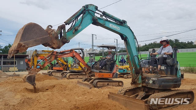 【부산=뉴시스】 제갈수만 기자 =부산 기장군농업기술센터는 30일 한국생활개선기장군연합회 소속 28명 여성농업인이 3t미만의 굴삭기와 지게차 등 소형농업기계 면허를 취득하는 성과를 거뒀다. 사진은 여성농업인의 굴삭기 교육을 받고 있다. 2018.08.30. (사진= 기장군 제공)