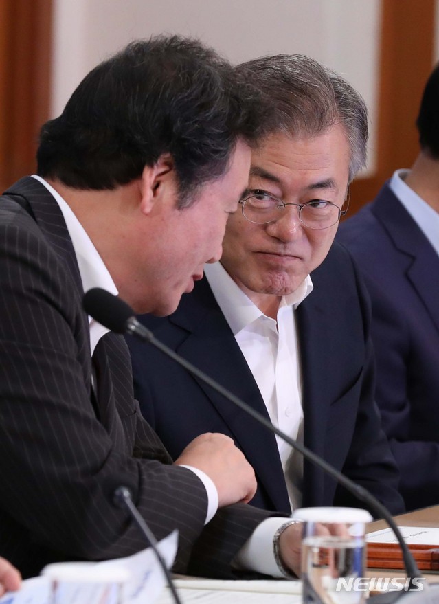 【서울=뉴시스】전신 기자 = 문재인 대통령이 30일 청와대 본관 충무실에서 열린 민선7기 시·도지사 간담회에서 이낙연 국무총리와 대화하고 있다. 2018.08.30.