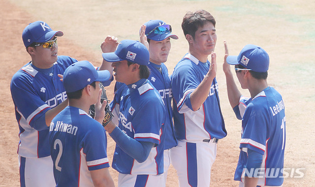 【자카르타(인도네시아)=뉴시스】추상철 기자 = 30일(현지시각) 오후 인도네시아 자카르타 겔로라 붕 카르노(GBK) 야구장에서 열린 2018 자카르타-팔렘방 아시안게임 야구 슈퍼라운드 대한민국과 일본의 경기. 7회말 수비를 무실점으로 끝낸 대한민국 선수들이 덕아웃으로 들어가며 기뻐하고 있다. 2018.08.30. (Canon EOS-1D X Mark Ⅱ EF100-400 f4.5-5.6 IS Ⅱ USM ISO 400, 셔터 1/800, 조리개 5.6)