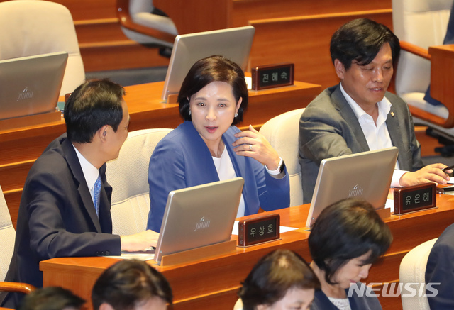 있【서울=뉴시스】고승민 기자 = 30일 오후 서울 여의도 국회에서 열린 제363회국회(임시회) 제1차 본회의에서 문재인 정부 2기 내각 사회부총리 겸 교육부 장관으로 내정된 더불어민주당 유은혜 의원이 우상호 전 원내대표와 대화하고 다. 2018.08.30.