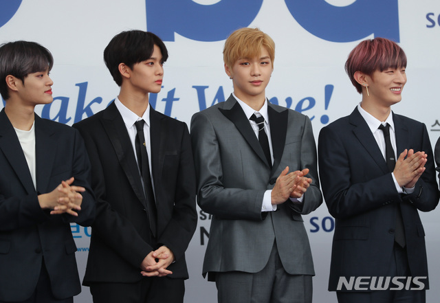 【서울=뉴시스】조수정 기자 = '2018 소리바다 베스트 케이(K)-뮤직 어워즈' 블루카펫 행사가 열린 30일 저녁 서울 송파구 방이동 올림픽공원 체조경기장에서 그룹 워너원이 박수치고 있다. 왼쪽부터 이대휘, 배진영, 강다니엘, 윤지성. 2018.08.30.