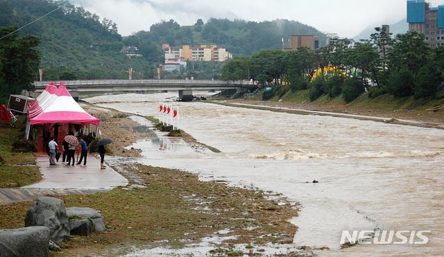 【괴산=뉴시스】김재광 기자 = 30∼31일 충북 중부지방에 내린 집중호우로 괴산·증평·음성군 주택과 농경지 침수피해가 속출했다.197㎜의 누적강수량을 기록한 괴산군 동진천 하상주차장이 물에 잠겨있다.2018.08.31