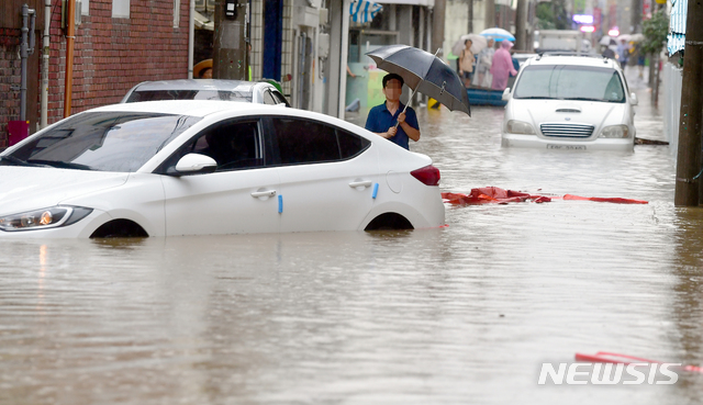 【광주=뉴시스】류형근 기자 = 호우특보가 내려진 31일 오전 광주 남구 주월동 주택가 골목길이 폭우에 침수된 가운데 주민들이 물에 잠겨버린 차량을 살펴보고 있다. 이지역은 지난 27일에도 폭우에 침수돼 많은 피해를 입었다. 2018.08.31.