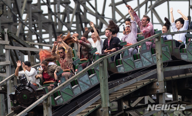 【서울=뉴시스】 에버랜드 할로윈 축제 오픈을 맞아 31일 좀비 연기자들이 손님들과 함께 경기도 용인시 에버랜드 T-익스프레스에서 극강의 스릴을 즐기며 담력 훈련을 하고 있다.