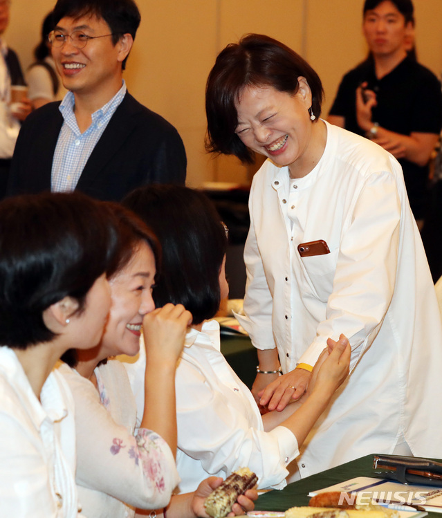 【예산=뉴시스】박영태 기자 = 31일 오후 충남 예산군 덕산 리솜리조트에서 진행된 더불어민주당 정기국회 대비 국회의원 워크숍에서 여성가족부 장관에 내정된 진선미 원내수석부대표가 여성 의원들과 이야기를 나누고 있다. 2018.08.31.
