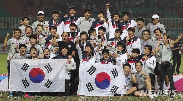 【치비농(인도네시아)=뉴시스】최진석 기자 = 1일(현지시각) 오후 인도네시아 치비농 파칸사리 스타디움에서 열린 '2018 자카르타·팔렘방 아시안게임' 남자 축구 시상식. 금메달을 차지한 대한민국 선수단이 정몽규 대한축구협회 회장과 기념촬영을 하고 있다. 2018.09.01.