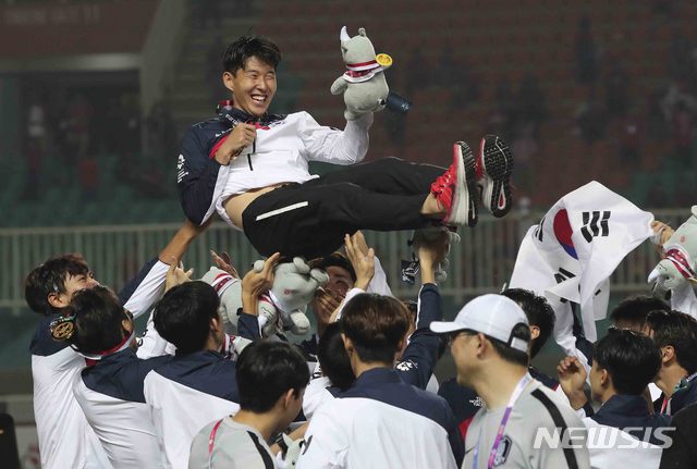 【치비농(인도네시아)=뉴시스】최진석 기자 = 1일(현지시각) 오후 인도네시아 치비농 파칸사리 스타디움에서 열린 '2018 자카르타·팔렘방 아시안게임' 남자 축구 시상식. 금메달을 차지한 대한민국 선수들이 손흥민을 헹가래 치고 있다. 2018.09.01.