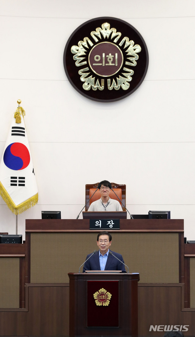 【서울=뉴시스】박주성 기자 = 박원순 서울시장이 2일 오후 서울 서울시의회 본회의장에서 열린 '2018 서울청년의회' 에서 인사말을 하고 있다. 2018.09.02.