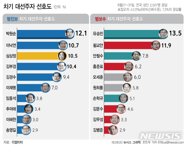 【서울=뉴시스】전진우 기자 = 여론조사 전문기관 리얼미터가 CBS 의뢰로 지난달 27~31일 5일간 전국 19세 이상 성인 남녀 2507명에게 범(汎)진보와 범 보수진영별 차기 대선주자 선호도 조사를 한 결과, 박원순 서울시장과 유승민 전 바른미래당 공동대표가 각각 1위로 집계됐다고 3일 밝혔다.