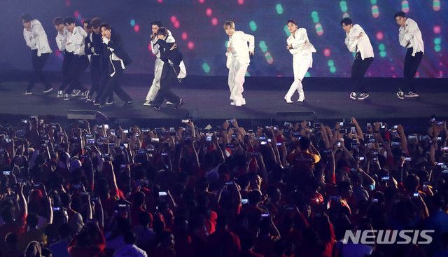 【자카르타(인도네시아)=뉴시스】추상철 기자 = 2018 자카르타-팔렘방 아시안게임 폐회식이 열린 2일(현지시각) 오후 인도네시아 자카르타 겔로라 붕 카르노(GBK) 메인 스타디움에서 한류스타 슈퍼주니어가 축하공연을 펼치고 있다. 2018.09.02.