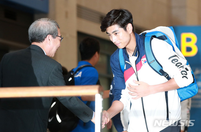 【인천공항=뉴시스】김선웅 기자 = 2018 자카르타-팔렘방 아시안게임에서 금메달을 획득한 대한민국 야구대표팀의 이정후가 3일 오전 인천국제공항을 통해 귀국하며 정운찬 총재와 악수를 하고 있다. 2018.09.03.