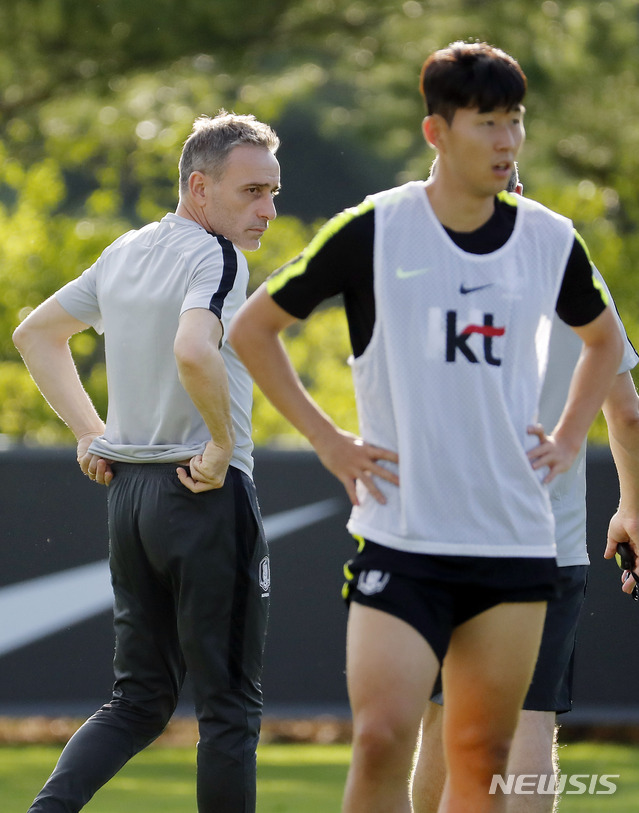 【파주=뉴시스】최동준 기자 = 4일 경기 파주 축구대표팀 트레이닝센터에서 열린 소집훈련에서 파울루 벤투 감독이 손흥민을 바라보고 있다. 대표팀은 오는 7일 코스타리카, 11일 칠레와 평가전을 치른다. 2018.09.04.