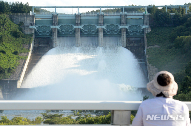【진안=뉴시스】 김얼 기자 = 전북 진안군 용담면 용담댐이 2013년 이후로 5년 만에 방류를 실시한 5일 거센 물살이 빠르게 내려오고 있다. 이날 오후 3시부터 방류를 시작한 용담댐은 초당 300톤가량을 방류해 하루 2080만 톤을 방류할 것으로 예상했으며 7일 오후 6시에 방류를 마친다. 2018.09.05