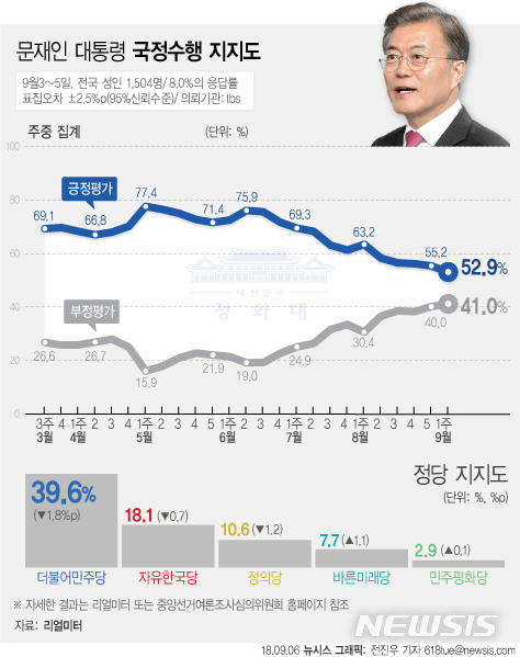 【서울=뉴시스】전진우 기자 = 리얼미터가 tbs 의뢰로 9월 3일~5일 전국 19세 이상 남녀 1504명을 조사해 6일 발표한 여론조사 결과에 따르면 문재인 대통령의 지지율은 지난주 주간집계 대비 2.3%p 하락한 52.9%이다.