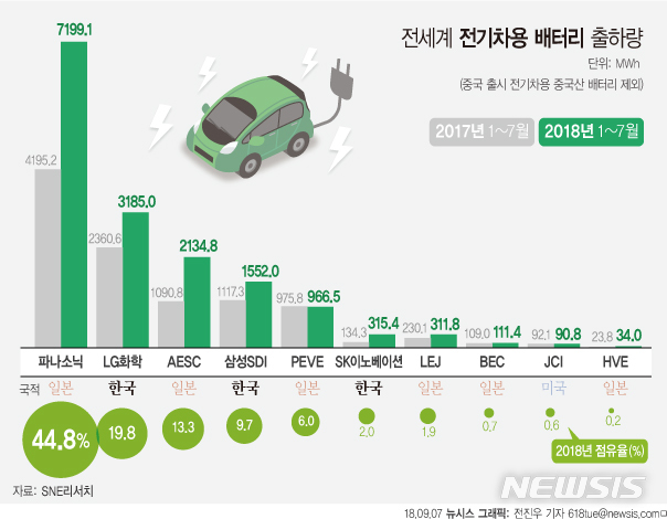 【서울=뉴시스】전진우 기자 = 7일 시장조사기관 SNE리서치에 따르면 올해 1월부터 7월까지 전 세계 전기차에 출하된 비중국산 배터리 출하량에서 국내 업체인 LG화학, 삼성SDI, SK이노베이션이 각각 2, 4, 6위를 차지했다.