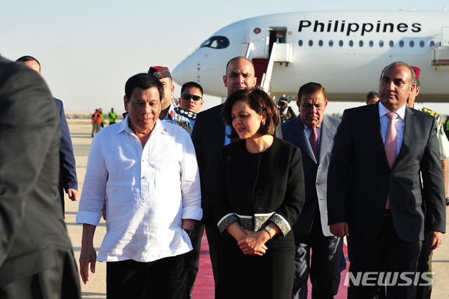 【암만(요르단)=뉴시스】  채정병 기자 = 5일(현지시간) 로드리고 두테르테 필리핀 대통령이 요르단 공식방문을 위해 암만 퀸알리아 국제공항 로얄파빌리온에 도착해 요르단 사회개발부 장관과 이야기하며 공항을 빠져나가고 있다. 2018.09.06