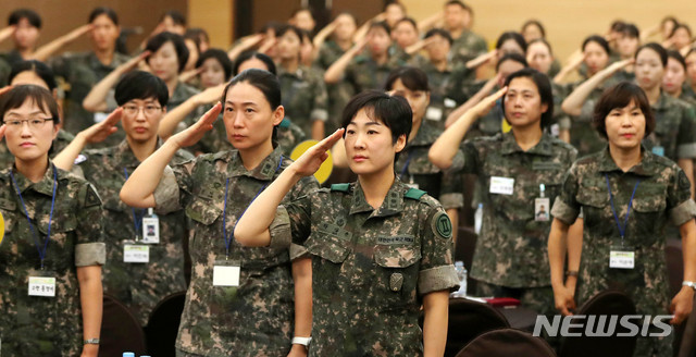 【서울=뉴시스】추상철 기자 = 제68주년 여군창설일 기념 '국방여성 리더십 발전 워크숍'이 열린 6일 오전 서울 용산구 국방컨벤션에서 참석한 여군들이 국기에 대한 경례를 하고 있다. 2018.09.06.