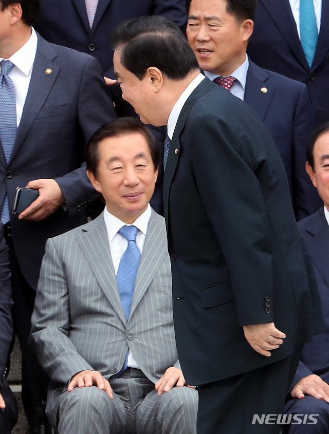 【서울=뉴시스】이종철 기자  = 6일 오전 서울 여의도 국회 본청 앞 계단에서 열린 개헌 70주년 국회의원들 단체사진 촬영에 참석한 문희상 국회의장이 한국당 김성태 원내대표 앞을 지나가고 있다. 2018.09.06.
