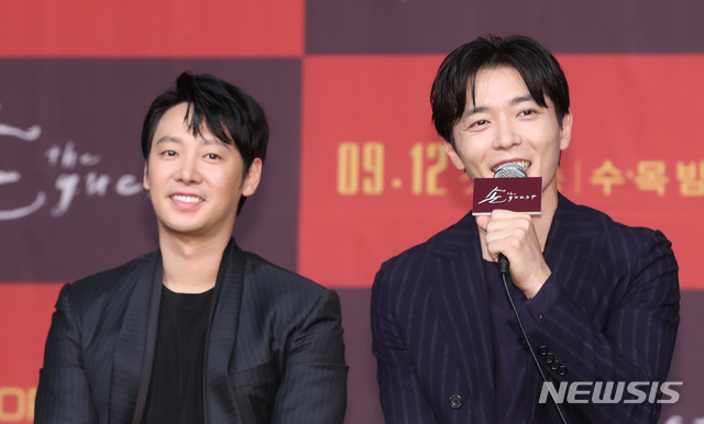 【서울=뉴시스】조수정 기자 = 배우 김동욱과 김재욱(오른쪽)이 OCN 수목드라마 '손 더 게스트(The Guest)' 제작발표회가 열린 6일 서울 영등포 타임스퀘어에서 취재진의 질문을 듣고 있다. 손 더 게스트는 오는 12일부터 매주 수, 목요일 밤 11시 방송된다. [email protected]