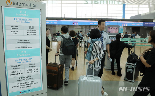 【인천공항=뉴시스】홍찬선 기자 = 태풍 제비가 일본 전역을 강타한 가운데 7일 오전 인천공항 제2여객터미널 대한항공 카운터에 일본 오사카와 삿포로 행 여객기가 현지 공항 폐쇄로 결항됐다는 안내문이 내걸려 있다. 2018.09.07.