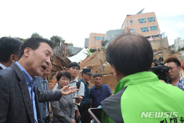 【서울=뉴시스】홍효식 기자 = 바른미래당 손학규 대표가 7일 오후 서울 동작구 상도초등학교 병설유치원 인근 공사장 붕괴현장을 방문해 동작구 재난안전대책본부 관계자와 대화를 나누고 있다. 2018.09.07.(사진=바른미래당 제공)