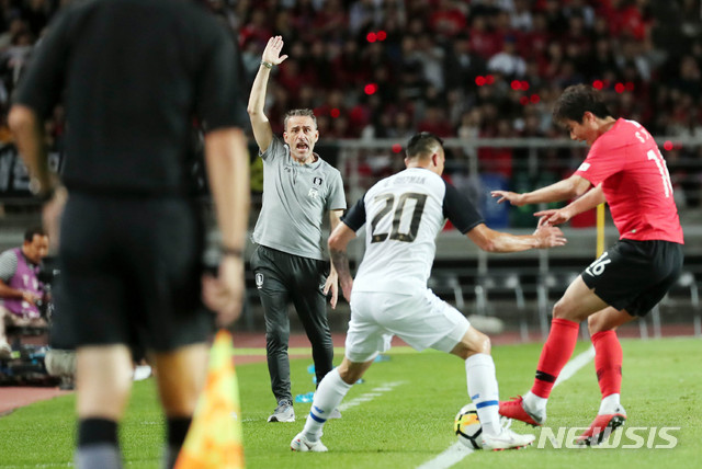 【고양(경기)=뉴시스】최진석 기자 = 7일 오후 경기 일산 고양종합운동장에서 열린 축구 대표팀 친선경기 대한민국과 코스타리카의 경기. 한국 파울루 벤투 감독이 심판 판정에 항의하고 있다. 2018.09.07.