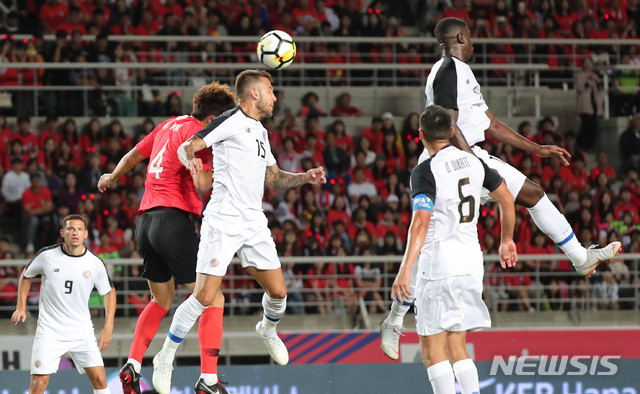 【고양(경기)=뉴시스】최진석 기자 = 7일 오후 경기 일산 고양종합운동장에서 열린 축구 대표팀 친선경기 대한민국과 코스타리카의 경기. 한국 김민재가 헤딩경합을 하고 있다. 2018.09.07.