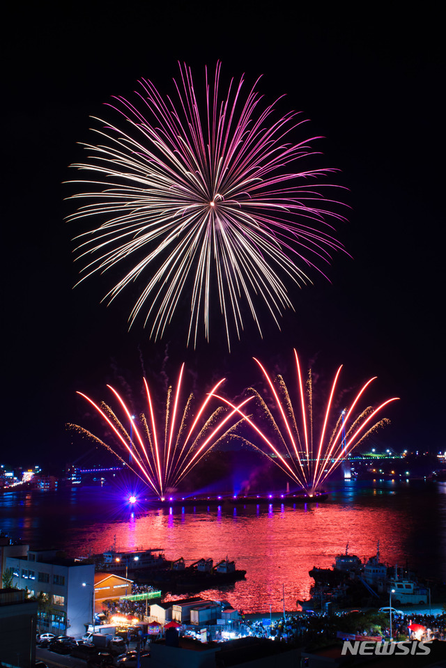 【여수=뉴시스】김석훈 기자 = 8일 오후 전남 여수시 이순신광장 앞 해상에서 '2018여수밤바다 불꽃축제'가 펼쳐지고 있다. 하늘로 쏜 불꽃이 형형색색 장관을 이루고 있다. 2018.09.08. (사진=여수시청 제공)