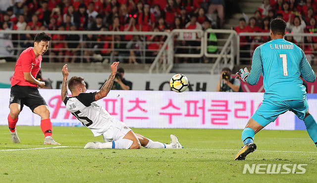 【고양(경기)=뉴시스】최진석 기자 = 7일 오후 경기 일산 고양종합운동장에서 열린 축구 대표팀 친선경기 대한민국과 코스타리카의 경기. 한국 남태희가 슛을 날리고 있다. 2018.09.07.