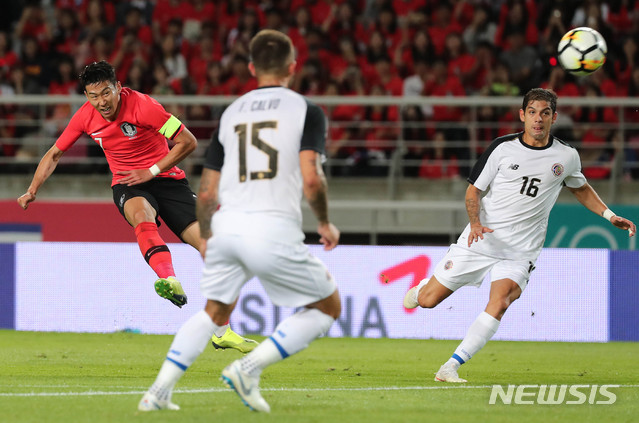 【고양(경기)=뉴시스】최진석 기자 = 7일 오후 경기 일산 고양종합운동장에서 열린 축구 대표팀 친선경기 대한민국과 코스타리카의 경기. 한국 손흥민이 슛을 날리고 있다. 2018.09.07.