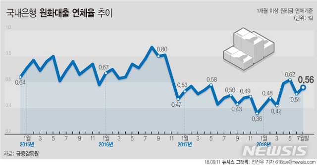 【서울=뉴시스】전진우 기자 = 11일 금융감독원에 따르면 지난 7월말 국내은행의 원화대출 연체율은 전월말대비 0.05%p 오른 0.56%로 집계됐다.