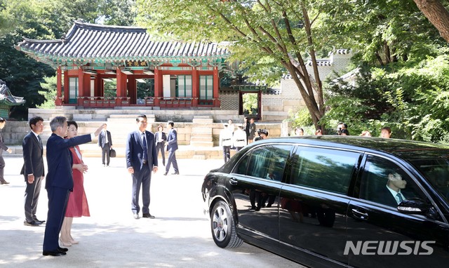 【서울=뉴시스】전신 기자 = 문재인 대통령과 부인 김정숙 여사가 10일 서울 종로구 창덕궁에서 조코 위도도 인도네시아 대통령 내외를 배웅하고 있다. 2018.09.10.