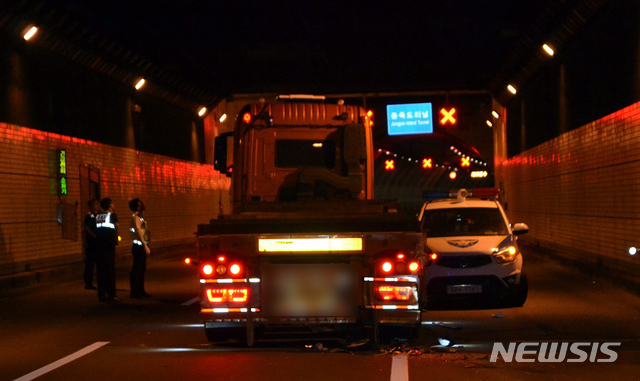 【부산=뉴시스】 하경민 기자 = 11일 부산과 경남 거제시를 잇는 거가대교 위에서 술에 취한 상태로 트레일러를 몰던 A(57)씨가 도로를 가로막고 차량을 들이받는 등 난동을 부리며 경찰과 대치하다 약 5시간 만에 붙잡혔다고 부산경찰청은 밝혔다.